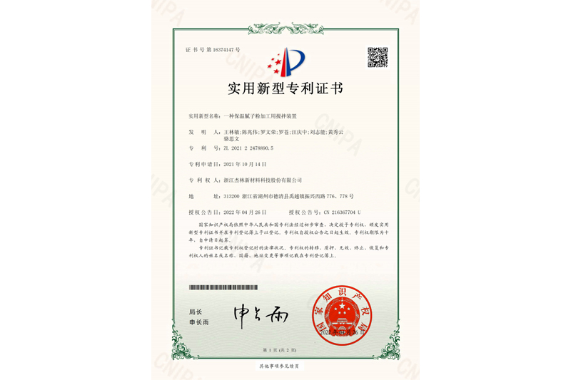 一種保溫膩子粉加工用攪拌裝置-實用新型專利證書