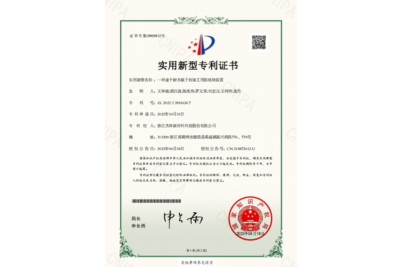 • 一種抗裂防水型外墻用膩子粉存儲設備-實用新型專利證書